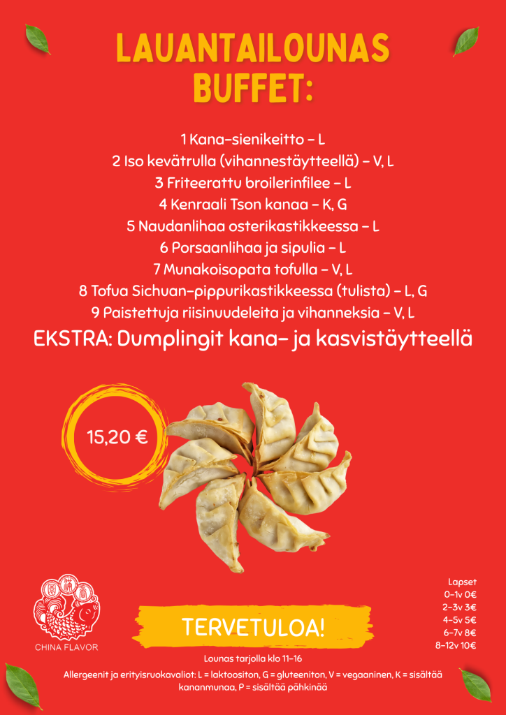 Monipuoliselta ruokalistaltamme löydät sekä kiinalaisen ruuan wokatut klassikkoannokset, että friteerattuja ja höyrytettyjä herkkuja. Ruokalistaltamme löydät myös mm. gluteenittomaan ja vegaaniseen ruokavalioon sopivia annoksia.